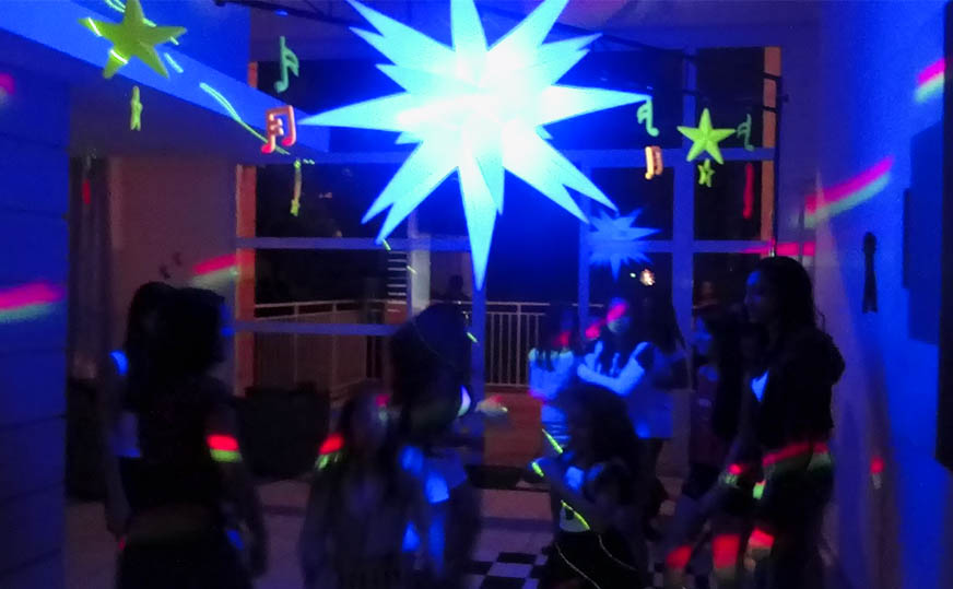 - Enfeites de teto e parede fluorescentes (cifras musicais e formas geométricas);